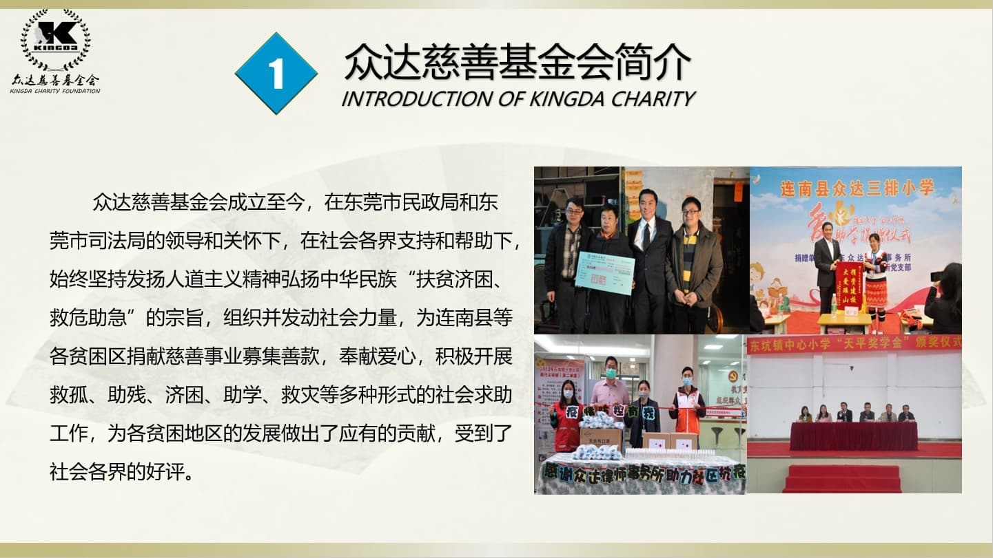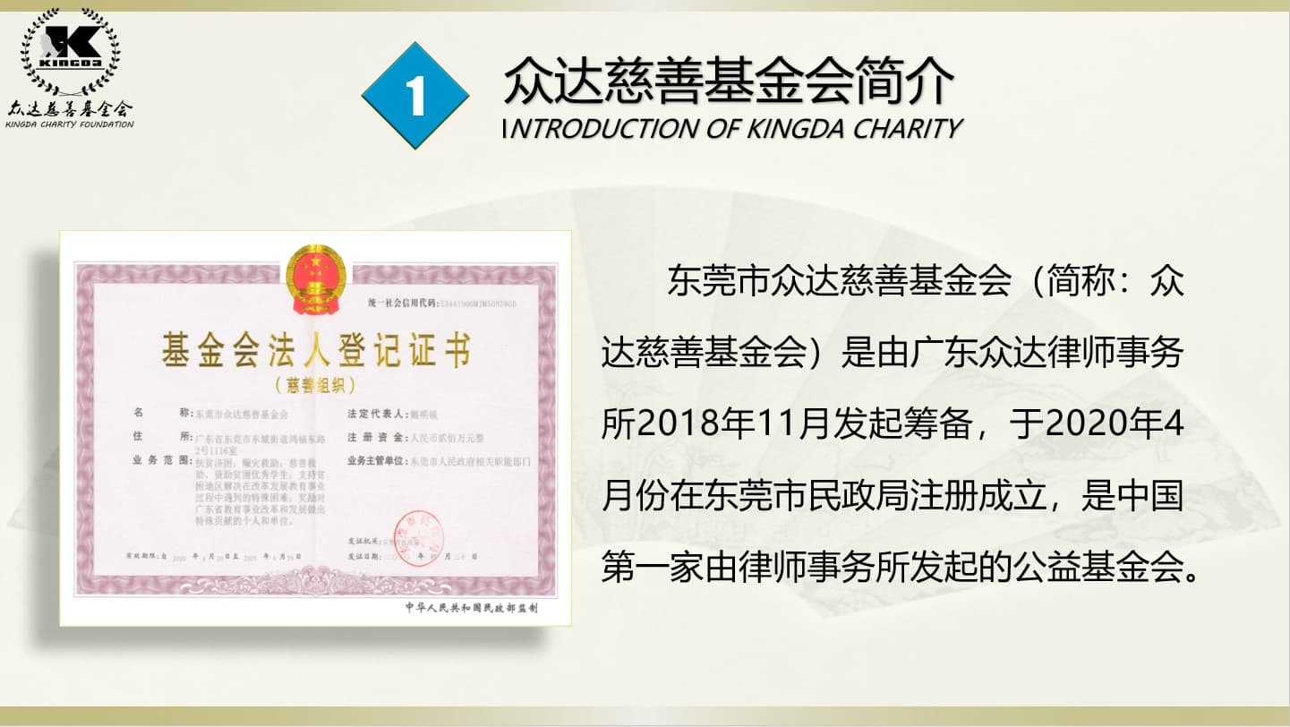 众达慈善基金,坚守企业初心,勇担社会责任。 众达集团将会持续捐资残疾儿童,致力为中国的教育民生事业做出无私的贡献。 2020年4月,众达集团出资数百万元发起成立东莞众达慈善基金,众达慈善事业正式规范启